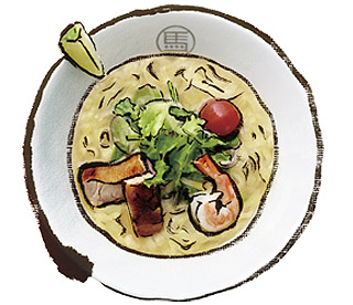 スープに絡む、薄めの自家製平打ち麺と一緒に召し上がっていだだきたい、セリやグリーンリーフなどの彩り野菜。アクセントにパンチの効いたガーリックテイストの海老と鶏肉を。お好みのタイミングでライムを搾って爽快な後味と香りをお愉しみいただけます。